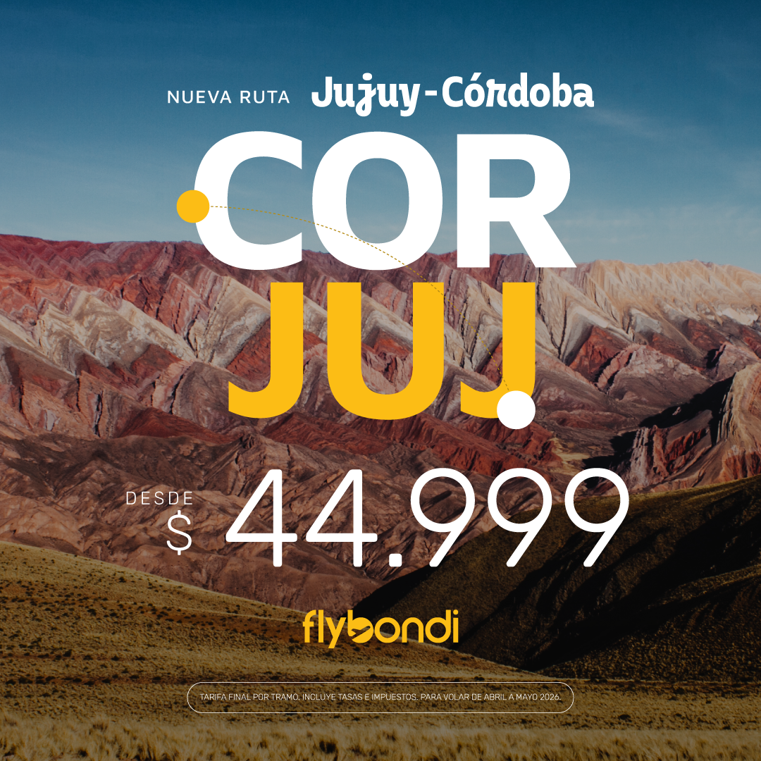 Buenos Aires, 27 de febrero de 2026- Flybondi, la primera aerolínea low cost de Argentina, anuncia el lanzamiento de una nueva ruta que conectará de manera directa Jujuy con Córdoba, a partir del 2 de abril. La nueva ruta tendrá tres vuelos semanales, los días martes, jueves y sábado, con tarifas promocionales desde $44.999 final por tramo. Los tickets ya se encuentran disponibles en www.flybondi.com.